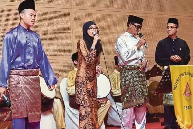 Persembahan dondang sayang diiringi dengan paluan gendang dan rebana.