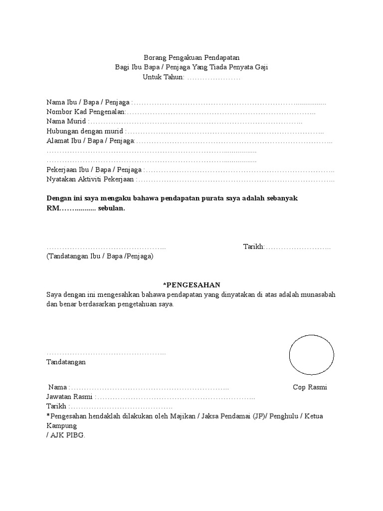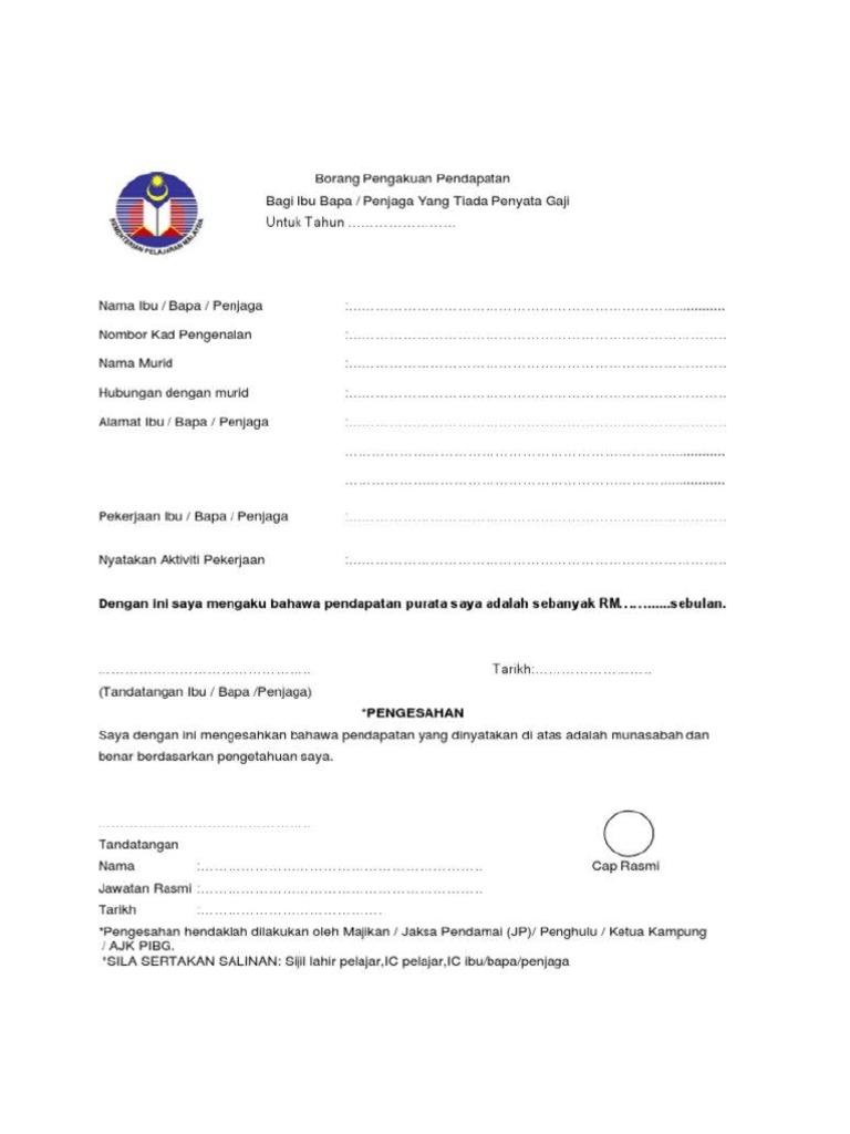 Related : Borang Pengakuan Pendapatan Bagi Ibu Bapa Yang Tiada Penyata Gaji : Bagi ibu/bapa/penjaga yang tiada penyata gaji/bekerja sendiri (diisi oleh ibu/bapa/penjaga)..